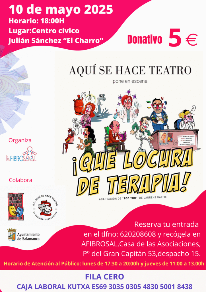 El sábado día 10 de mayo a las 18:00h, tendrá lugar la representación de la obra de teatro «¡Qué Locura de Terapia!» que, de forma altruista, la compañía de teatro `Aquí Se Hace Teatro´ nos ofrece a todos los asistentes, con el objeto de recaudar fondos que nos permitan seguir llevando a cabo nuestra actividad dentro la Asociación.